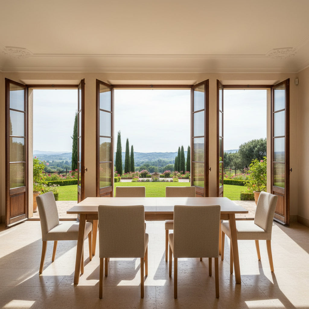 La structure principale est en bois massif, la table à manger possède un long plateau et des pieds fins, et les chaises de salle à manger ont des assises rembourrées de tissu et des cadres en bois massif, avec des lignes simples et élégantes.